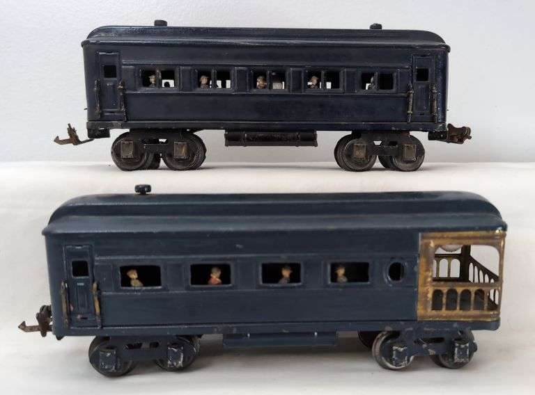 Prewar Dorfan O/Narrow Gauge Pullman and Observation passenger cars, repainted in a dark blue. Underside of frame is green. Observation car is missing a roof screw. Both cars feature die-cast passenger figures. No missing trim.