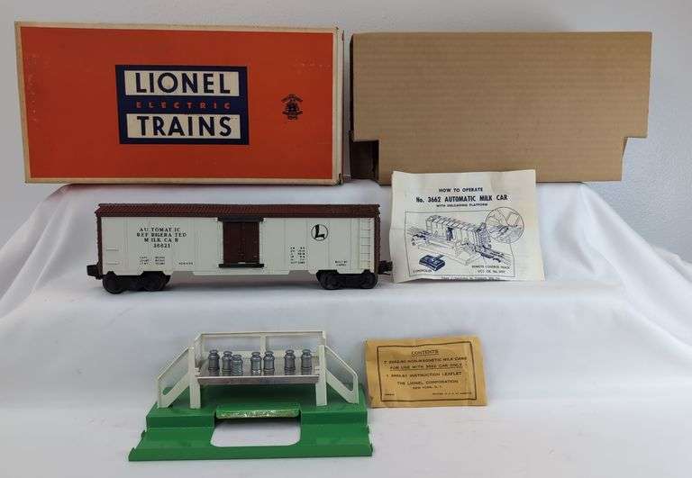 Postwar Lionel O Gauge 3662 operating milk car in original box with 3462P milk platform, original insert and components envelope with instructions sheet and seven milk cans, unrun C9. Box matches car, insert is just as nice P9. This is a fantastic looking item for the top shelf grade collector.