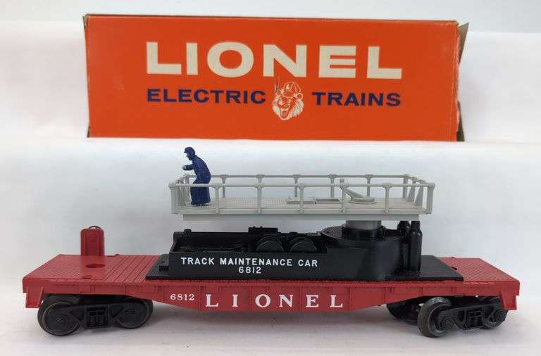 Postwar Lionel O Gauge 6812 Track Maintenance flat car in original display box with unpunched display panel. Some slight punching in around the Push In Tab area. "Push In Tab" tab and display panel are fully in tact and look fantastic. Box has an end flap that is nearly torn off and other end has near perfect flaps. Box is clean, very bright, very square and very solid. Train only has one worker.