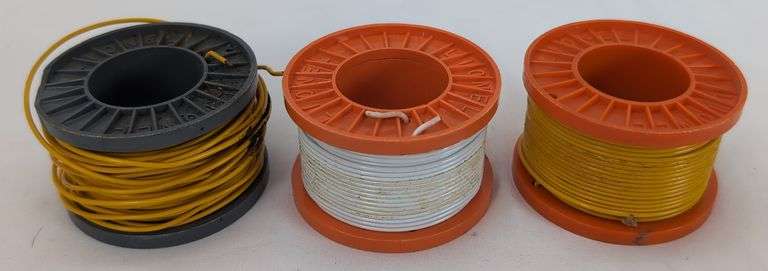 Three Postwar Lionel O Gauge No. 40 Hook Up wire and cable reels. Two orange cable reels with white and yellow wire, both missing the plastic tape strip, unused. Gray cable reel with yellow wire, chipped edge, some wire may be missing. Please view the photos for the best description and condition of the items in this lot.