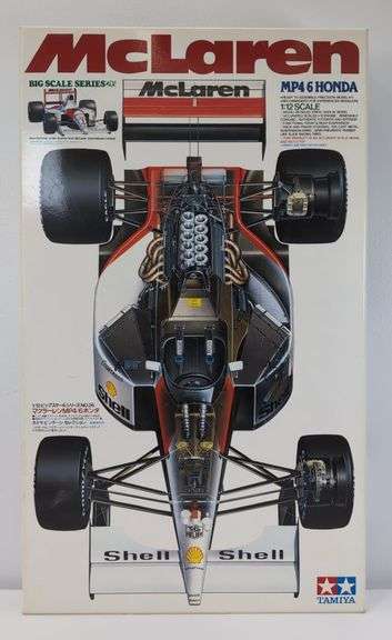 Tamiya Item 12028-14800 McLaren MP4/6 Honda 1/12 Scale Model Kit. Open box kit with parts on sprue in factory sealed packages, literature, instructions, decals, etc. Box shows no wear, bright, clean, square and solid.