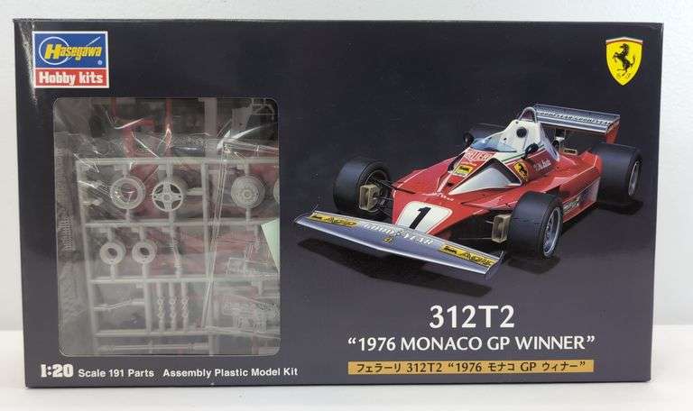 This is a 1/20 scale model kit by Hasegawa, of the Ferrari 312T2 that won the 1976 Monaco GP, No. 23201. It features highly detailed plastic parts and included etched metal parts. The kit is unassembled and requires glue and paint for completion. Includes decals. Open box kit with parts on sprue in factory sealed packages, literature, instructions, decals, etc. Box shows no wear, bright, clean, square and solid.