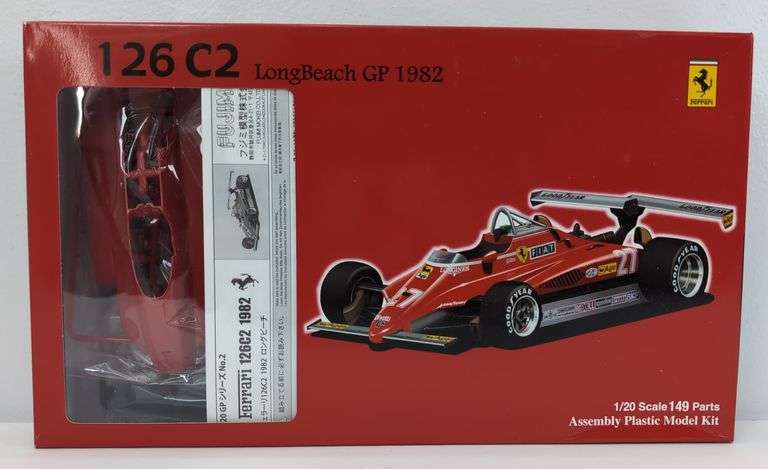 This is a 1/20 scale GP 2 model kit by Fujimi 090337, featuring the Ferrari 126C2 racing car from the 1982 Long Beach Grand Prix. The kit includes numerous parts to assemble a detailed replica of the vehicle. Open box kit with parts on sprue in factory sealed bags, literature, instructions, decals, etc. Box is bright and clean with little wear, square and solid.