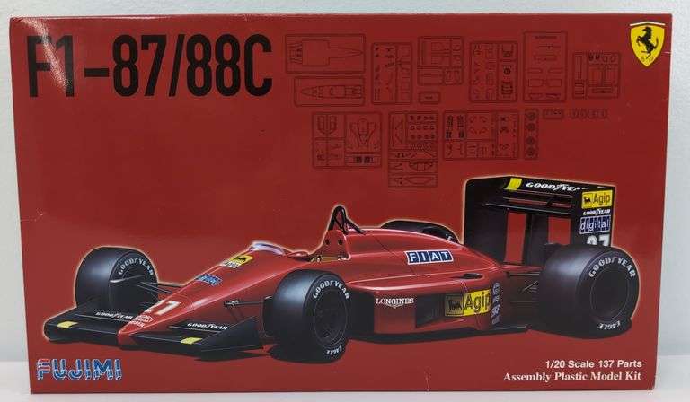Fujimi 091983-4500 1/20 scale GP 6 plastic model kit of a Ferrari F1-87/88C. Open box kit with parts on sprue in factory sealed packages, literature, instructions, decals, etc. Box is bright and clean with little wear, square and solid.