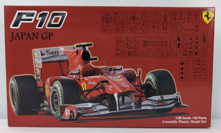 Fujimi 090870-5000 1/20 scale GP 32 model kit of the Ferrari F10 Japan GP race car. It's an assembly plastic model kit with approximately 130 parts. Open box kit containing parts on sprue in factory sealed packages with literature, instructions, decals, etc. Box shows little wear, bright, clean, square and solid.