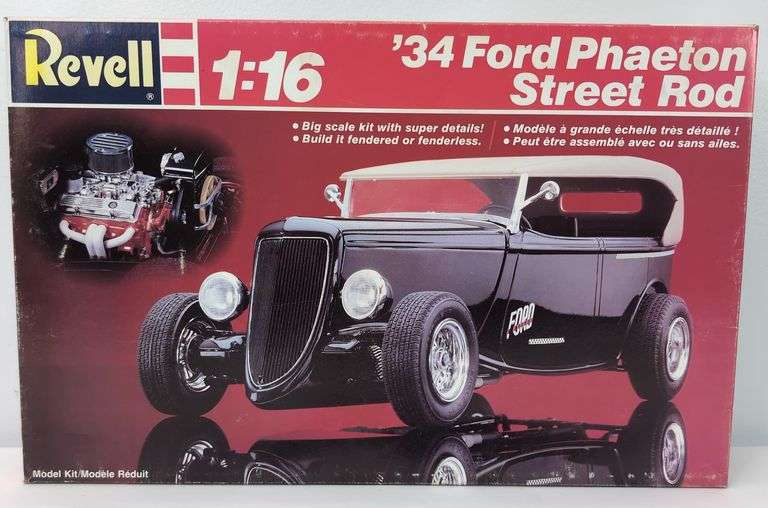 Revell 1:16 scale '34 Ford Phaeton Street Rod Model Kit, 7473. Open box kit with parts on sprue in factory sealed packaging. Parts on sprue out of bag. A few loose parts. Kit appears complete and un-assembled. Literature, instructions, decals, etc. included. Box shows little wear, bright, clean, square and solid.