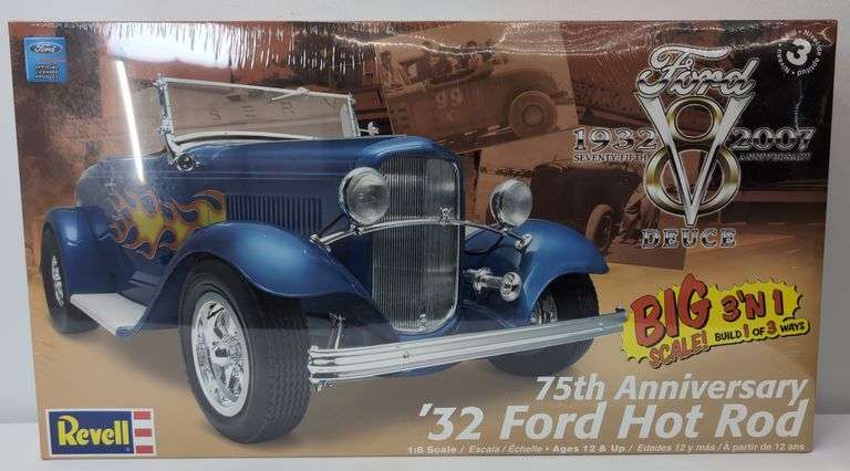 Revell 85-2620 1932 Ford Hot Rod 75th Anniversary 3 in 1, 1:8 Scale Model Kit. The box features a 1932 Ford hot rod with flame decals and other versions. The kit is skill level 3 and contains parts to build it in 1 of 3 ways. Kit is Mint, factory sealed, never opened. Overwrap is un-torn.