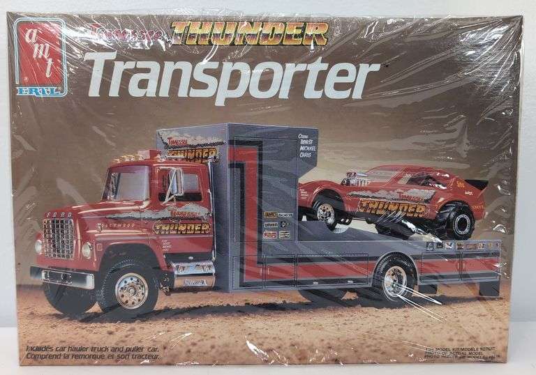 This lot features an AMT Ertl Ford LN8000 Tennessee Thunder Transporter Model Kit #6636. Open box kit with parts on sprue in factory sealed packaging with literature, instructions, decals, etc. Overwrap was removed from bottom and is still intact on box lid. Box is bright, clean, square and solid.