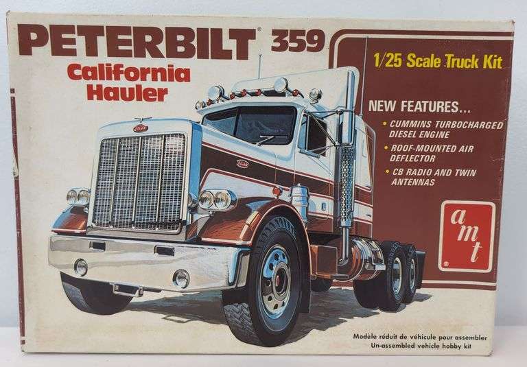 AMT Peterbilt 359 California Hauler 1/25 Scale Truck Kit, model number T501. The kit includes parts to assemble a Cummins Turbocharged Diesel Engine, and features a roof-mounted air deflector and CB radio with twin antennas. Open box kit with parts on sprue in factory sealed packaging. Kit includes decals, no instructions or literature. Kit appears complete. Box is bright, clean, square and solid with a little concaving to lid and a price sticker.