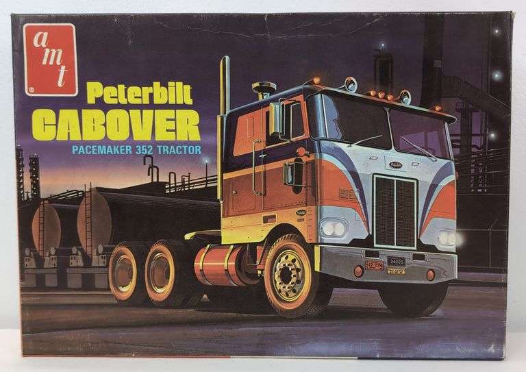AMT T502 1/25th scale model kit featuring the Peterbilt Cabover Pacemaker 352 Tractor. Open box kit with some parts on sprue in factory sealed packaging, some parts on sprue in open bag, some parts on sprue out of bag. Literature, instructions, decals, etc. included, kit appears complete. Box shows a little light wear, bright, clean, square and solid.