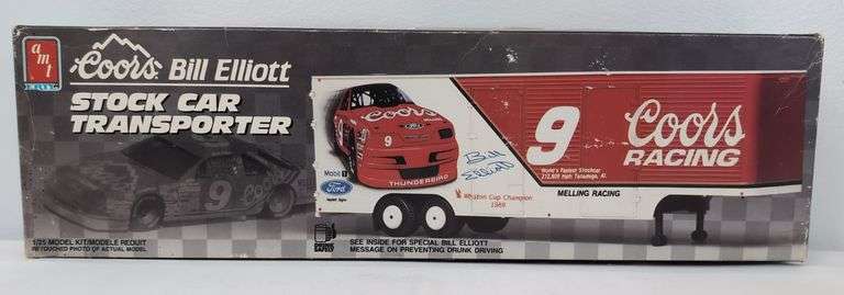 This lot features an AMT/ERTL 1/25 scale model kit #6019, the Coors Bill Elliott Stock Car Transporter. Un-assembled open box kit containing parts on sprue in factory sealed packaging, literature, instructions, decals, etc. Box shows light wear, signs of storage, square and solid.