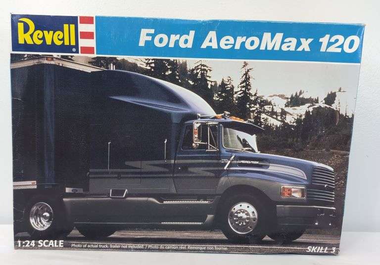 This auction features a Revell 7247 Ford Aeromax 120 1:24 scale model kit. This kit includes unassembled plastic parts, decals, and instructions for assembly in factory sealed bag. The completed model will be a detailed replica of the Ford Aeromax 120 semi-truck. Skill level 3. Box has warping, bright, clean, square and solid with little wear.