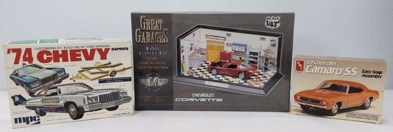 This lot features three Chevrolet model kits. One is an MPC 1/25 scale '74 Chevy Caprice 1-7404-250, another is an AMT 1/43 scale '69 Camaro SS easy snap assembly 6905, and the third is a Metal Die-Cast Corvette model display kit in 1/43 scale. AMT and MPC kits are open box kits appearing to be complete containing parts on sprue in factory sealed bags, literature, instructions, decals, etc. Metal Die-Cast is Mint, factory sealed with slightly torn overwrap, still intact. Open box kit boxes are bright, clean, square and solid with little wear.