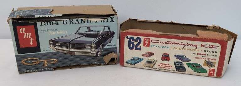 Two AMT model car kits: a 1964 Grand Prix 6654-200 and a '62 Mercury Comet Customizing Kit. Both kits are assembled. Comet appears to be complete with no damage or missing parts. Pontiac has detached parts, parts on sprue, loose parts, instructions. Boxes are both worn. Both kits are very neatly assembled.