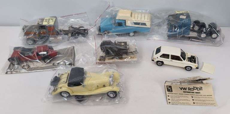 This lot features a collection of assembled plastic model cars and trucks. Includes a VW Rabbit, a convertible car, pick up truck with camper and two semi truck. Some loose and detached parts. Some kits may have missing parts. Please view the photos of the items in this lot carefully as they are being sold as they are shown in our photos with NO returns or refunds.