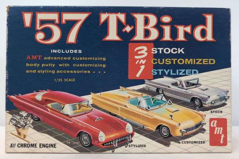 AMT '57 T-Bird 3 Stock in 1 Customizing kit 1/25 Scale, box with parts on sprue, various instructions sheets, various decal sheets, interior vinyl sheet, etc. Various other body parts included. Please view the photos of the items in this lot carefully as they are being sold as they are shown in our photos with NO returns or refunds.