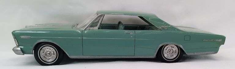 1966 Ford Galaxie 500 7 litre dealer promotional toy car. Car has silver painted accents and trim. Car has broken piece of front passenger front fender and detached rear bumper. Car has overall sun/florescent light fading. Car is unmarked as to manufacturer.