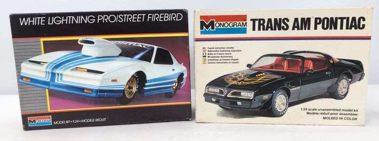 Two Monogram 1/24 scale model kits, one kit is a Trans Am Pontiac 2247 and the other is a '30 Ford Touring in a White Lightning Pro/Street Firebird box. Both kits are unassembled and appear complete containing parts on sprue, some loose parts, instructions, decals, etc. Boxes are bright, clean, square and solid showing little wear.