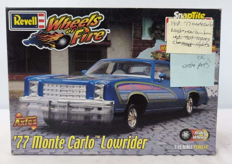 Revell Wheels of Fire '77 Monte Carlo Lowrider 1:25 Scale Model Car Kit, 85-1918. Unassembled open box kit appearing complete (except rear bumper is missing) containing parts on sprue, literature, instructions, decals, etc. Also included is an assembled, painted and decaled example of this kit that has been very neatly assembled with a nice spray paint finish. Box shows a little wear to some edges and corners, bright, clean, square and solid.