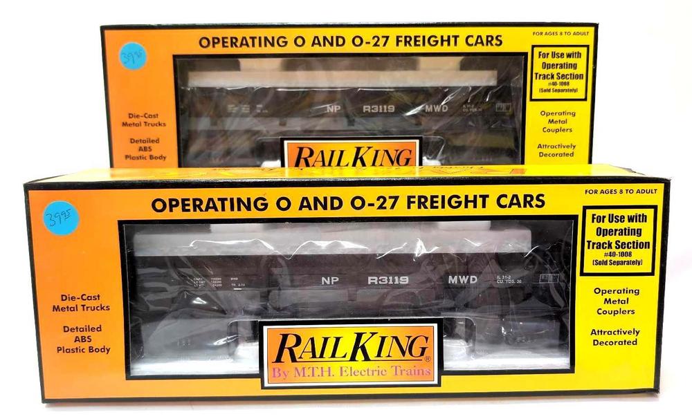 Modern Era Rail King O Gauge two 30-7924 Northern Pacific NP dump car with operating bay in original box, C8 with light run time on wheels and rollers. Boxes show little wear, price stickers, clean, bright, square and solid.