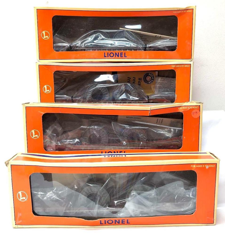 DescriptionModern Era Lionel O Gauge four 16983 Pennsylvania 6983 F9 well car in original boxes. Trains look C8 with light run time on wheels. Boxes show light to mild wear and warping, loose cellophane, price stickers, tape repairs, etc. Boxes are still fairly square and solid.