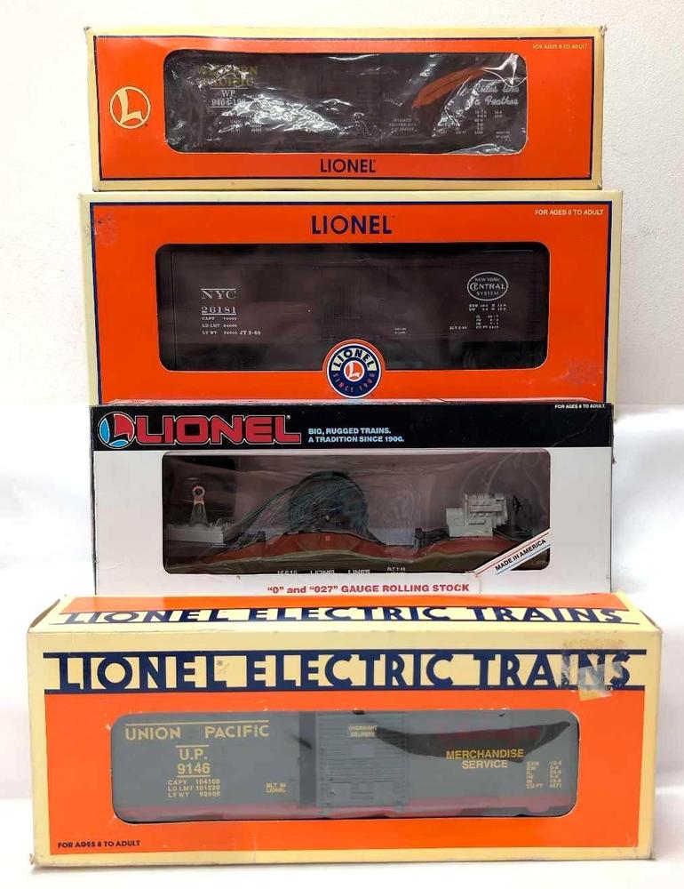 DescriptionModern Era Lionel O Gauge 17233 Western Pacific 9464 box car, 16615 Lionel Lines extension searchlight car with removable searchlight, 19821 Union Pacific operating boxcar, 26181 New York Central NYC wood-sided reefer in original boxes. Trains look C8 with light run time on wheels and rollers. Boxes show light to mild wear, some price stickers, some fading. Boxes are square and solid.