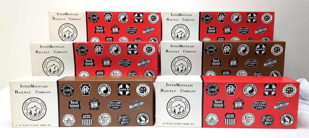 DescriptionModern Era InterMountain O Scale Railroad Train Cars Model Kits, unbuilt in original boxes, with instructions. ORUR1902 Steel Sided AGAR Packing Company NO. 326, Steel Sided Dubuque NO. 63902 A.A.R. class RSM, OBDR3026 1937 A.A.R. D&RGW Cookie Box white car No. 60026 W corner post end, ORUR1180 Steel Sided Ice Bunker Dubuque car NO. 63180 A.A.R. class RSM, 21313-12 ACF type 27 riveted 8,000 gallon Globe Oil Co. tank car No. 8499 and 20309-05 Steel Sided Iowa Beef Packers Ice Bunker Car No. 774 class R-40-10. Boxes have some crushing to lids, some staining, some storage dust/grime, price/inventory stickers, boxes are still fairly square and solid.