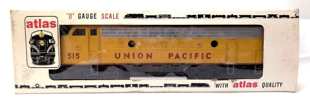 DescriptionModern Era Atlas O Gauge 2-Rail UP Union Pacific F-9 powered diesel locomotive unit in original Atlas box, re-identified as UP 515. Train should clean C7+ with run time. Box shows light wear, hand writing, some storage discoloration. Square and solid.