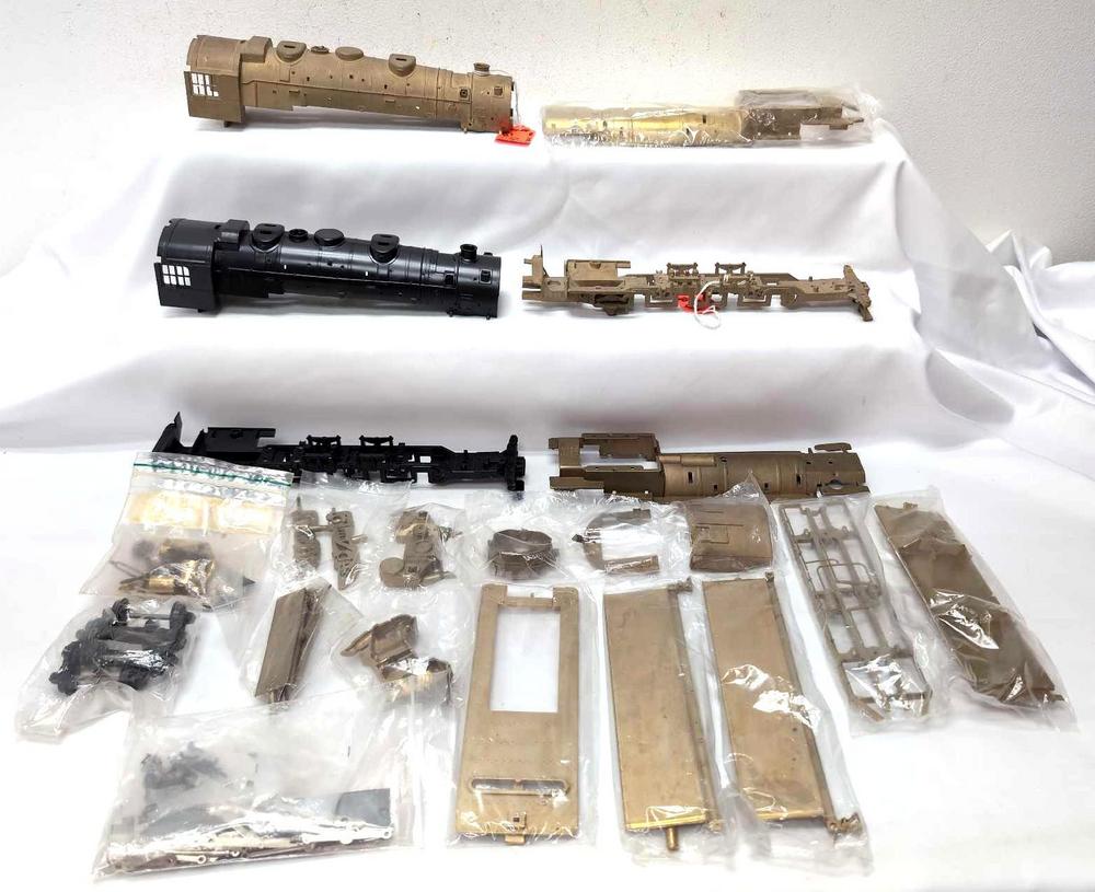 DescriptionO Scale 2 or 3 Rail Monon E1/E2 4-8-0 steam locomotive, unassembled brass trim, pieces and parts. Sheet of note paper has some information regarding "possibly Monon 4-8-0 E-1 E-2. 0-8-0 Indiana Harbor Belt O Gauge switcher decals sheet. Plastic pieces to cast. Plastic shell and frame. Brass shell and frame, floors and sides, cab roof, trim, parts, pieces. Numerous sheets of literature, diagrams, drawings and such included. Truck assemblies, side frames, cylinders, etc. This is a nice clean assembly of parts. Please view the photos of the items in this lot carefully as they are being sold as they are shown in our photos with NO returns or refunds.