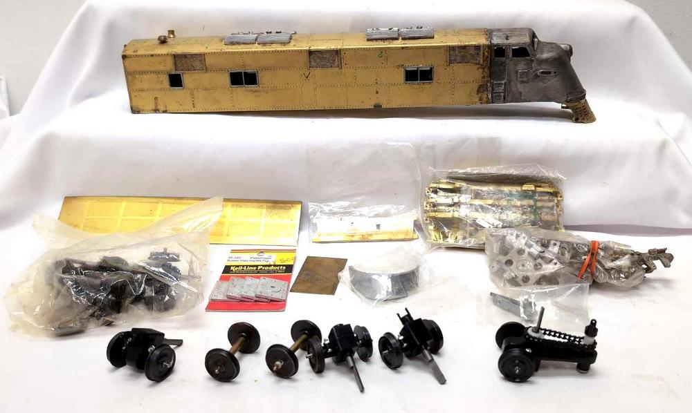 Description2-Rail brass O Scale Locomotive Workshop? EMD E-6 diesel locomotive, partially built body. Rest of kit is unbuilt, numerous trim parts, truck assemblies, more. Construction photos, Champs City of San Francisco decals, data sheets, articles and other inspirational material included. Please view the photos of the items in this lot carefully as they are being sold as they are shown in our photos with NO returns or refunds.