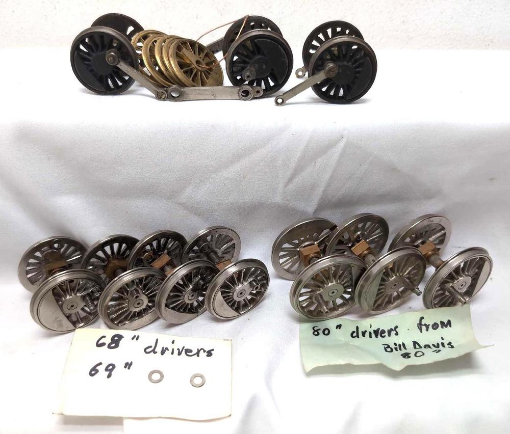 Description2-Rail O Scale brass and steel driver wheels and axles some geared, four 68", three 63" and three 80". Please view the photos of the items in this lot carefully as they are being sold as they are shown in our photos with NO returns or refunds.
