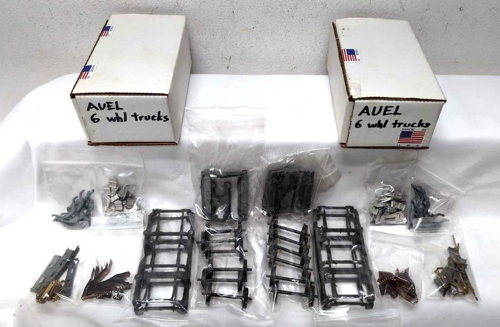 Two 2-Rail O Scale AUEL 6 wheel trucks, NIB New In Box, unassembled. Please view the photos of the items in this lot carefully as they are being sold as they are shown in our photos with NO returns or refunds.