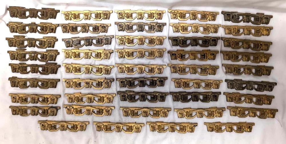 Forty-four die-cast O Scale brass 6 wheel truck side frames, undrilled and unmarked. Please view the photos of the items in this lot carefully as they are being sold as they are shown in our photos with NO returns or refunds.