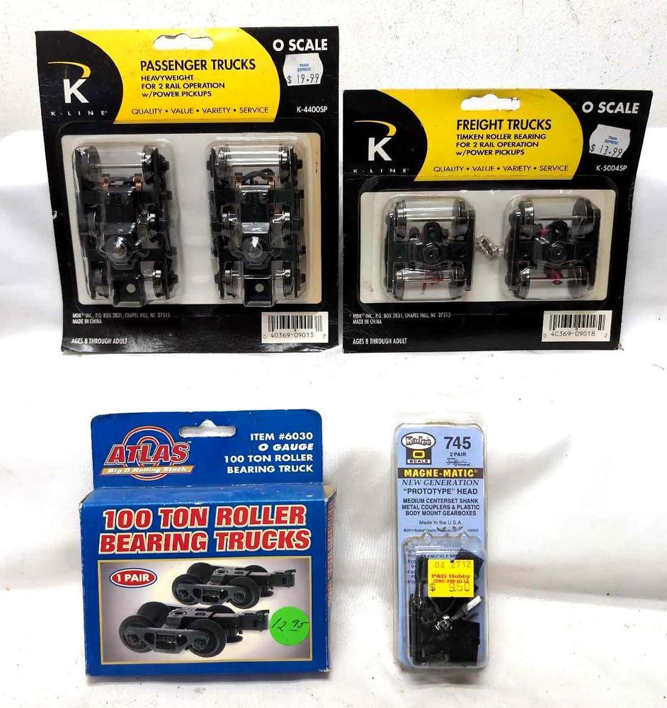 Description2-Rail O Scale K-Line K-5004SP Timken Roller Bearing freight trucks with power pickups, K-4400SP Heavyweight passenger trucks with power pickups, New in original packages. Atlas 6030 100 Ton Roller Bearing trucks, New in original package. Kadee 745 one pair couplers, New in original package. Please view the photos of the items in this lot carefully as they are being sold as they are shown in our photos with NO returns or refunds.