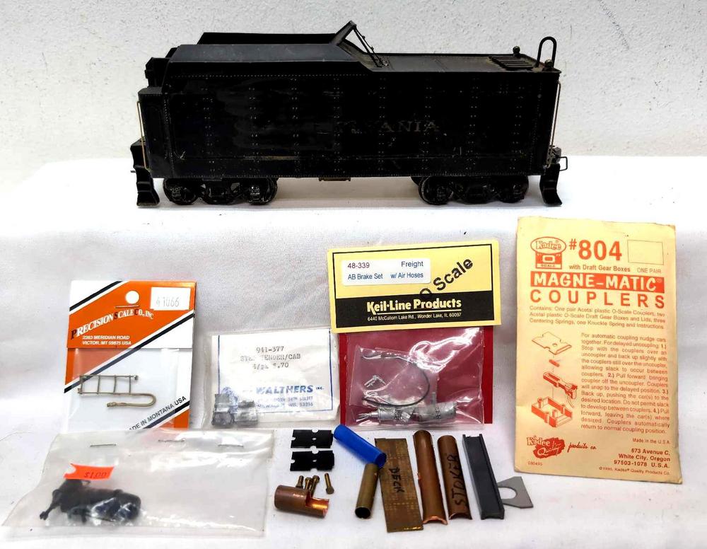 DescriptionKit/Scratch built 2-Rail O Scale Pennsylvania K-4 tender, painted and lettered, non-operating Kadee coupler. Tender needs cleaned and would look C6 but could be restored to any condition. Wheels show run time. Additional tender parts and trim included, some in original packages. Please view the photos of the items in this lot carefully as they are being sold as they are shown in our photos with NO returns or refunds.