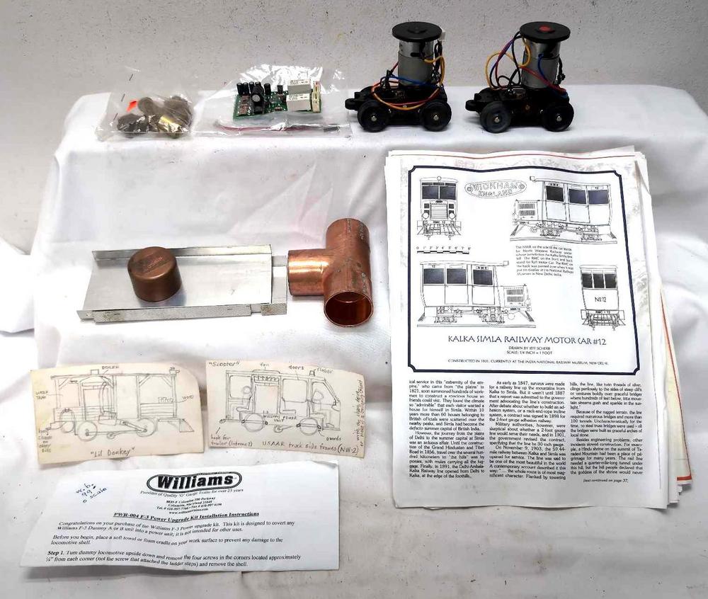 DescriptionO Gauge parts for various 4 wheel powered units. Two Williams O gauge powered 2-wheel truck assemblies. Electronic board with plug. Various parts to construct various 4 wheel locomotive units. Several sheets of data, diagrams and inspirations for building various trains from.