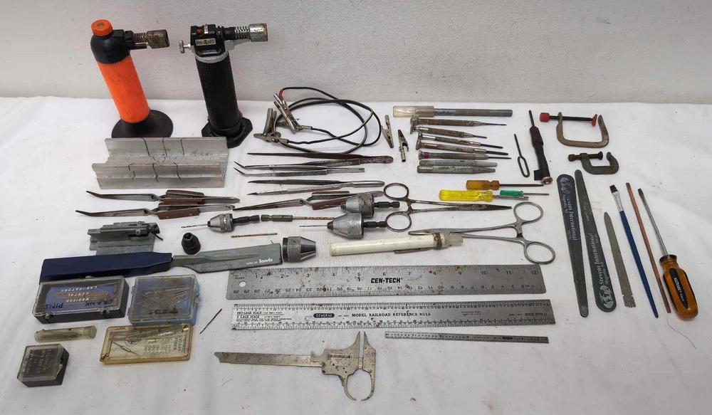 DescriptionModeling tools for trains, cars airplanes, ships and/or other hobbies. Micro drill bits, jigs, miter box, torches, screw drivers, steel rulers, files and other items. Please view the photos of the items in this lot carefully as they are being sold as they are shown in our photos with NO returns or refunds.