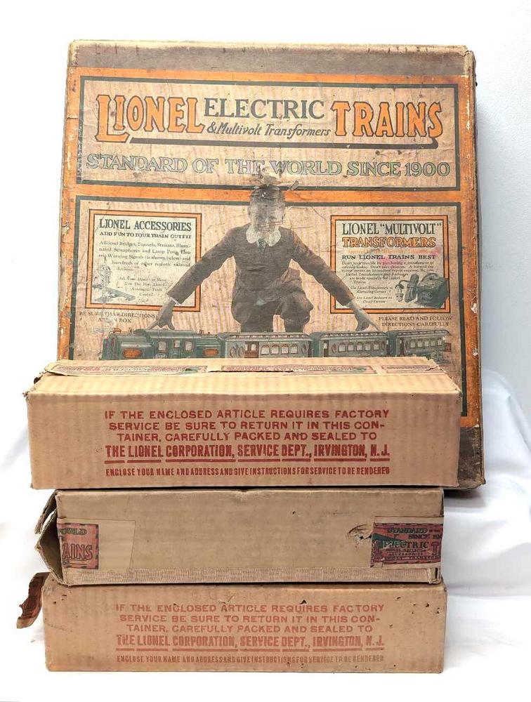 DescriptionPrewar Lionel Standard Gauge Outfit No. 347E red electric passenger train, original set box with one split lid corner, age darkening, light wear around edges, some rippling to lid. Very nice label on end panel, no apparent RED marking/stamp. 8E RED electric locomotive, 337 RED Pullman coach, 338 RED observation, original train boxes.