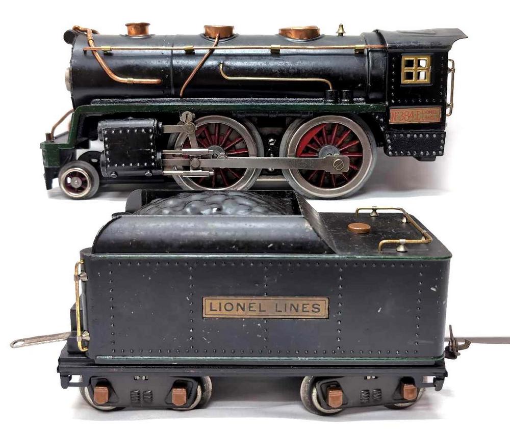 DescriptionPrewar Lionel Standard Gauge 384 2-4-0 steam locomotive with copper piping and green stripe, 384T tender with green stripe. Trains have repainted stripes, touchups to steam chests. Trains look nicer C6, should clean and polish to look a little better.