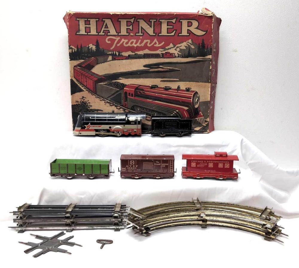 DescriptionHafner Trains Streamlined Steam freight set in original box with curved track, straight track, 45 degree crossover, 2000 streamline steam locomotive and tender, 91876 Hafner Trains gondola, 14825 ATSF Santa Fe box car with operating doors and 614333 Chicago and North Western caboose, C6+. Box has wear to corners, concaving to lid. Several of the curved track rails are recycled tin.