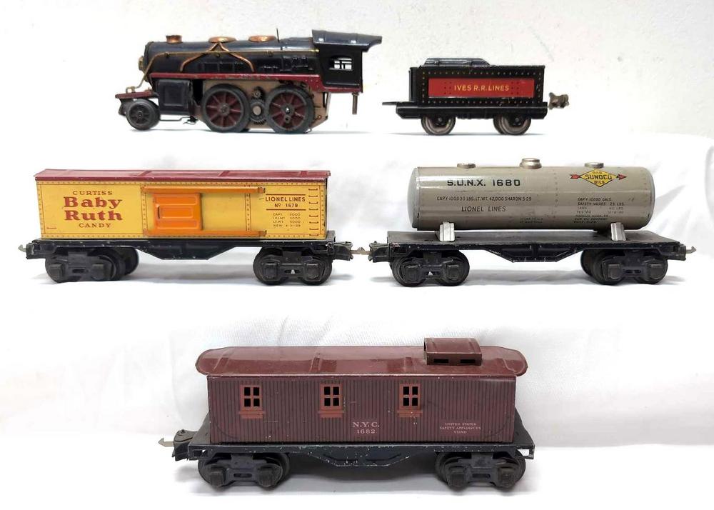DescriptionPrewar Ives/Lionel O Gauge transitional set No. 7003W Special. Set is comprised of Lionel-Ives 1661E 2-4-0 steam locomotive and Ives R.R. Lines tender, Lionel 1680 Sunoco 3 dome tank, Lionel Lines 1679 Baby Ruth box and 1682 N.Y.C. New York Central caboose. Loco drive wheels have casting fatigue. Trains should clean and polish to look very nice C6. No inner car boxes. Set box has very small tears at corner and an outer flap fold. Flaps have been somewhat folded inward. Label is slightly faded, but fully intact and well legible. Box is still fairly square and solid with light wear.