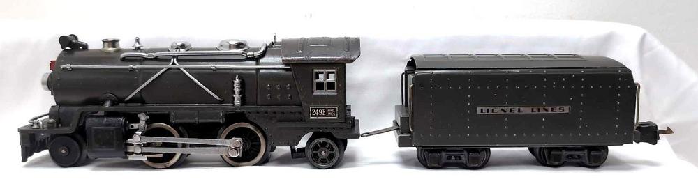 Prewar Lionel O Gauge 249E 2-4-2 steam locomotive and tender in gun metal gray, very nice clean and shiny C6+.