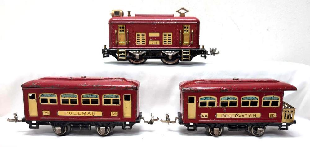 Prewar Lionel O Gauge 248 boxcab electric locomotive with 629 Pullman coach and 630 Observation car, red passenger trains, C5-6.