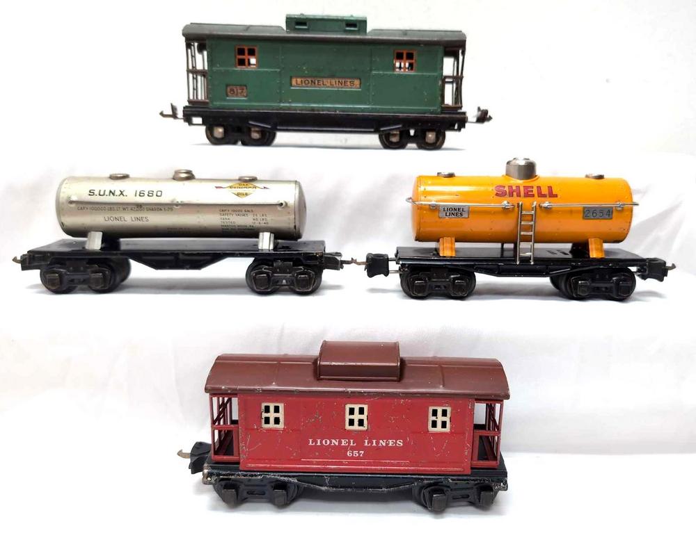 Prewar Lionel O Gauge 657 caboose C6, 817 caboose C5, 1680 Sunoco three dome tank C6 and 2654 Shell one dome tank C6, freight trains. Nice lot of trains for an operating layout, no missing couplers or coupler parts, no missing journals.