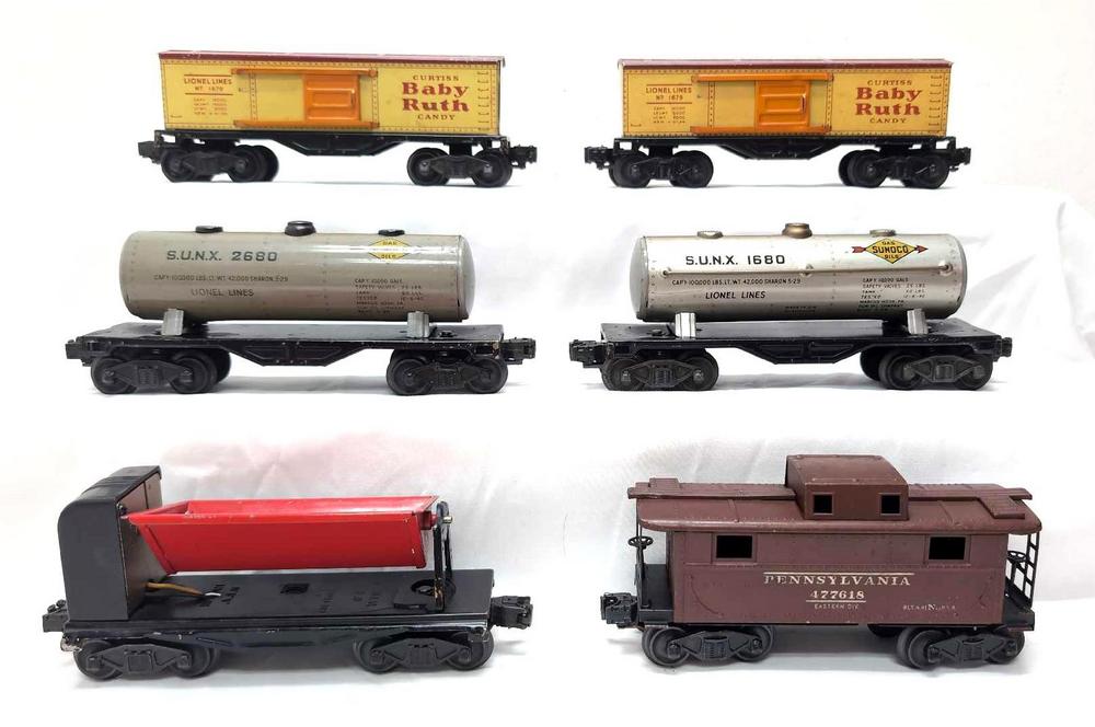 Postwar Lionel O Gauge two 1679 Lionel Lines Baby Ruth box cars, 1680 and 2680 Sunoco three dome tank cars, 3559 automatic dump car and 2672 Pennsylvania caboose. Trains are clean and shiny C6 to C6+.