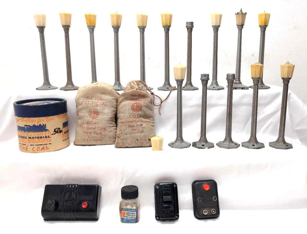 DescriptionPostwar Lionel O Gauge 35 lamp post, fourteen 71 lamp posts, two 206 bags of artificial coal, 97C Automatic Hopper controller, 364C control switch, 96C control switch, SP partial bottle of Smoke Pellets, Model Hobbies O-S Coal in container. Please view the photos of the items in this lot carefully as they are being sold as they are shown in our photos with NO returns or refunds.