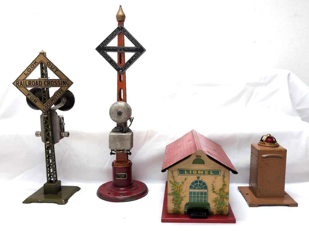 Prewar Lionel O and Standard Gauge 069 bell ringing crossing signal, 48W whistle station, 91 circuit breaker. American Flyer O/Wide Gauge bell ringing crossing signal. Accessories look nicer clean C6.