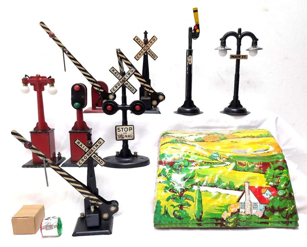 Marx O Gauge street lamp, crossing gates, semaphore signal, block signals, highway crossing flasher, lithographed tinplate 2-pc tunnel, C6.