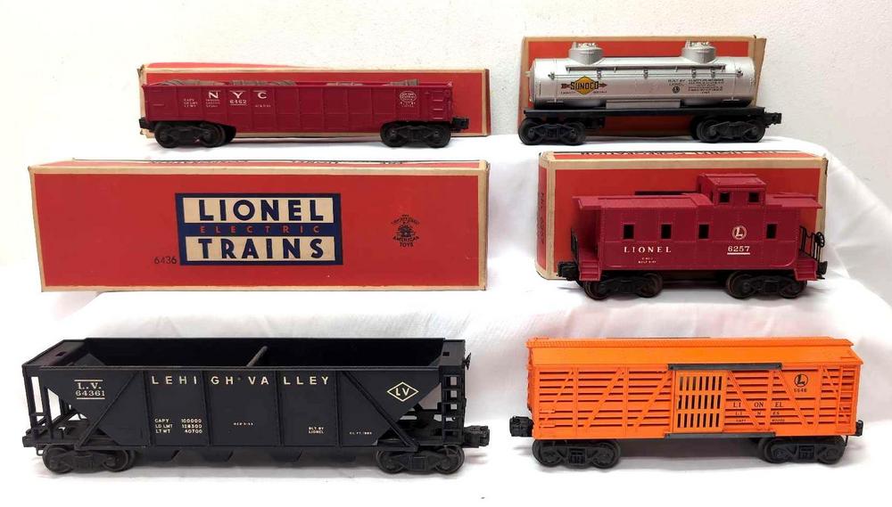DescriptionPostwar Lionel O Gauge 6462-125 NYC New York Central gondola, 6436 Lehigh Valley LV hopper with spreader bar, 6465 Sunoco two dome tank, 6257-25 SP type caboose in original boxes. 6656 stock car, no box. Trains look C6+/C7. 6462-125 box has a detached inner coupler protection flap. Boxes are clean, bright, square and solid with no missing flaps.