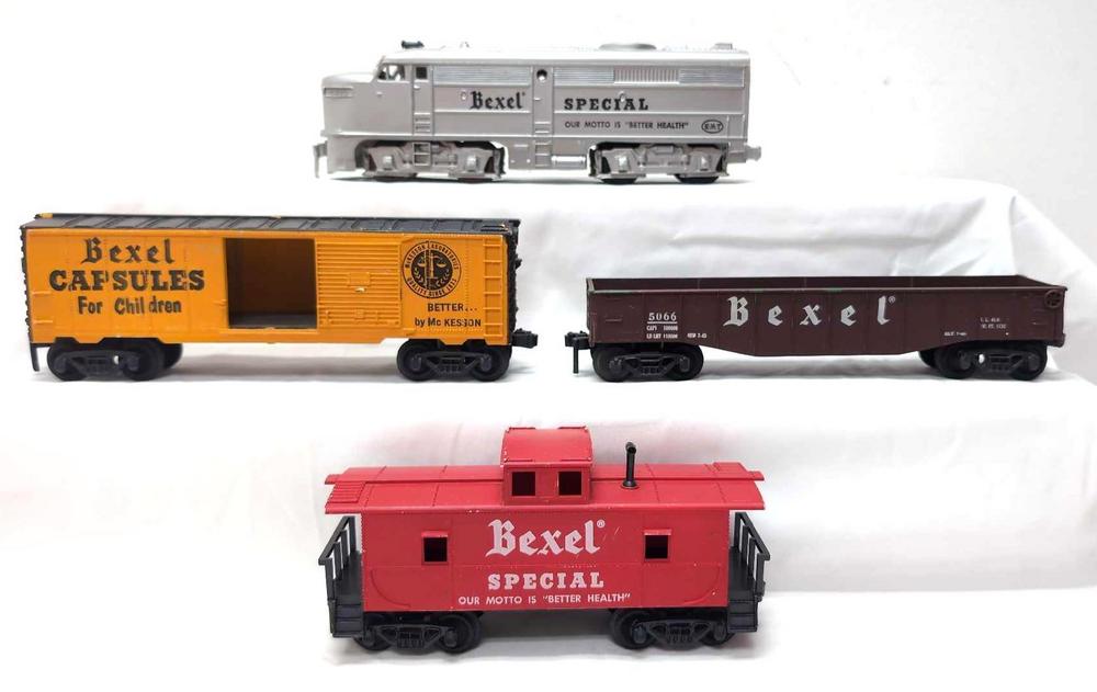 DescriptionKusan Model Trains O Gauge 2-rail Bexel Special diesel four piece freight set with Bexel Special powered Alco diesel A unit, 5066 Bexel gondola, Bexel Capsules for Children boxcar and Bexel Special caboose. Trains look very clean and shiny C6.